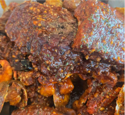 매콤한 소스가 해산물과 고기 사이사이 스며들어 고소하면서도 매운 풍미가 입안을 가득 채웁니다. 손으로 직접 먹으며 소스를 맛보는 재미도 색다릅니다.